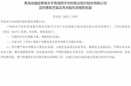 1月6日金融一线消息,青海金融监管局发布批复,同意青海西宁农村商业银行定向募股方案,募集股份7亿股。同意五矿(青海)特色产业投资基金管理有限公司股东资格。